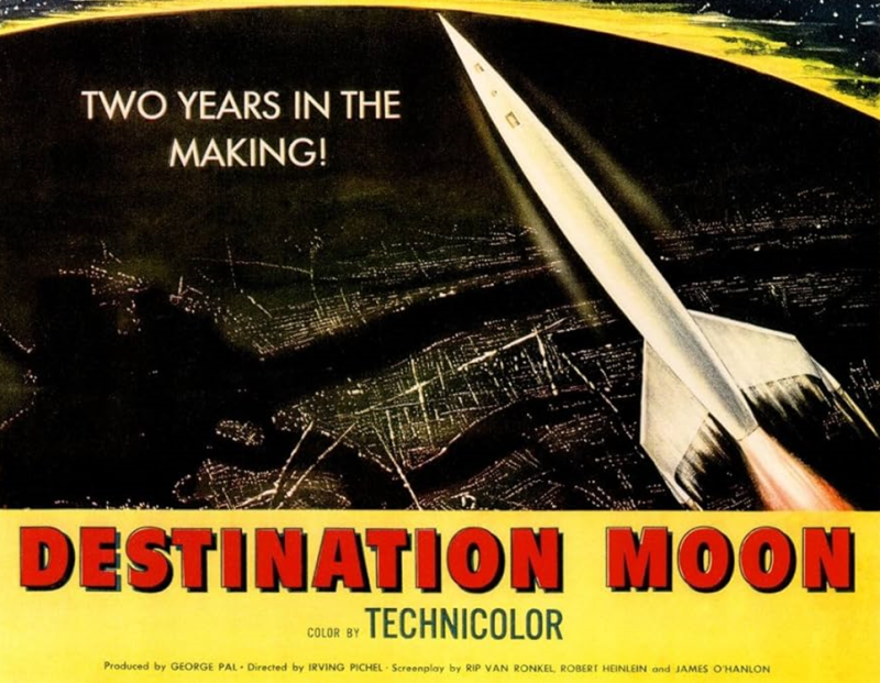 В американской картине «Место назначения — Луна» (Destination Moon, 1950) лунная тема заметно удаляется от сказочной условности ранней фантастики и впервые получает почти программно реалистическое измерение. Авторы сосредотачиваются не столько на чуде полета, сколько на его технической, организационной и цивилизационной логике: Луна предстает как достижимая цель, требующая научного знания, инженерной подготовки и политической воли. Именно здесь особенно ясно ощущается важный поворот в истории экранной Луны: она перестает быть лишь пространством приключения и превращается в образ будущего, в котором научный прогресс, государственные амбиции и идея освоения нового рубежа оказываются неразделимы.