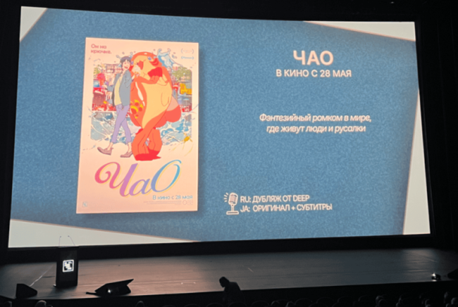 2 апреля компания Иноекино на Международном кинорынке и форуме Российский кинобизнес провела презентацию, посвященную своим предстоящим проектам. Генеральный директор дистрибьютора Евгений Крас представил ре-релизы сразу нескольких культовых картин, а также три новых фильма — две анимационные ленты и следующую работу режиссера Хирокадзы Корээды. 28 мая прокатчик выпустит японский анимационный фильм «Чао», рассказывающий об обществе будущего, где люди и русалки живут бок о бок. Стефан, обычный офисный работник, внезапно получает предложение жениться от Чао — принцессы из королевства русалок. Ранее картина получила Приз жюри Международного фестиваля анимации в Анси, а также главный приз в Международном конкурсе Большого фестиваля мультфильмов.