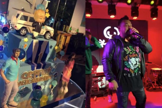 Мальчик весь вечер принимал поздравления. На праздник приехал даже певец Сергей Жуков. Он выступил для гостей, исполнив хиты группы «Руки вверх!». Под заводные треки никто не мог усидеть на одном месте. Молодые родители танцевали под любимые песни. Кульминацией праздника стал многоярусный дизайнерский торт. Его украшали фигурки с изображениями мамы, папы и героев мультфильма «Босс Молокосос».